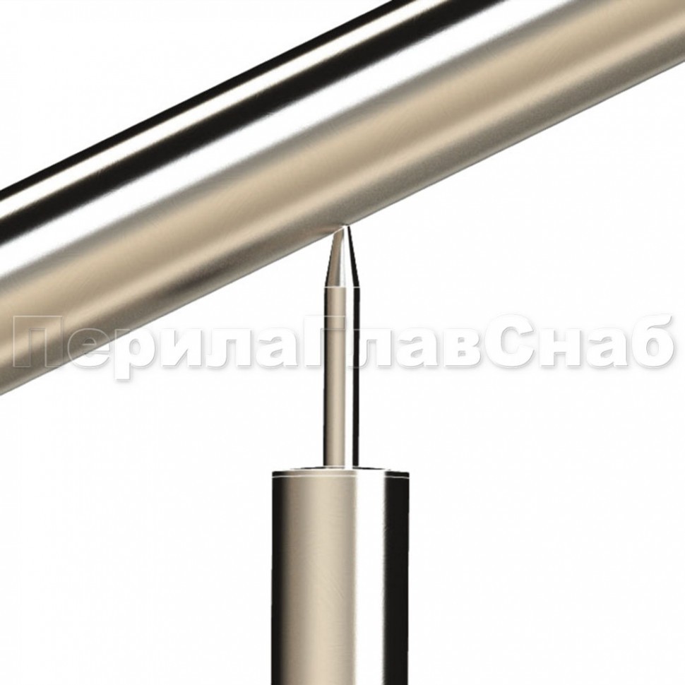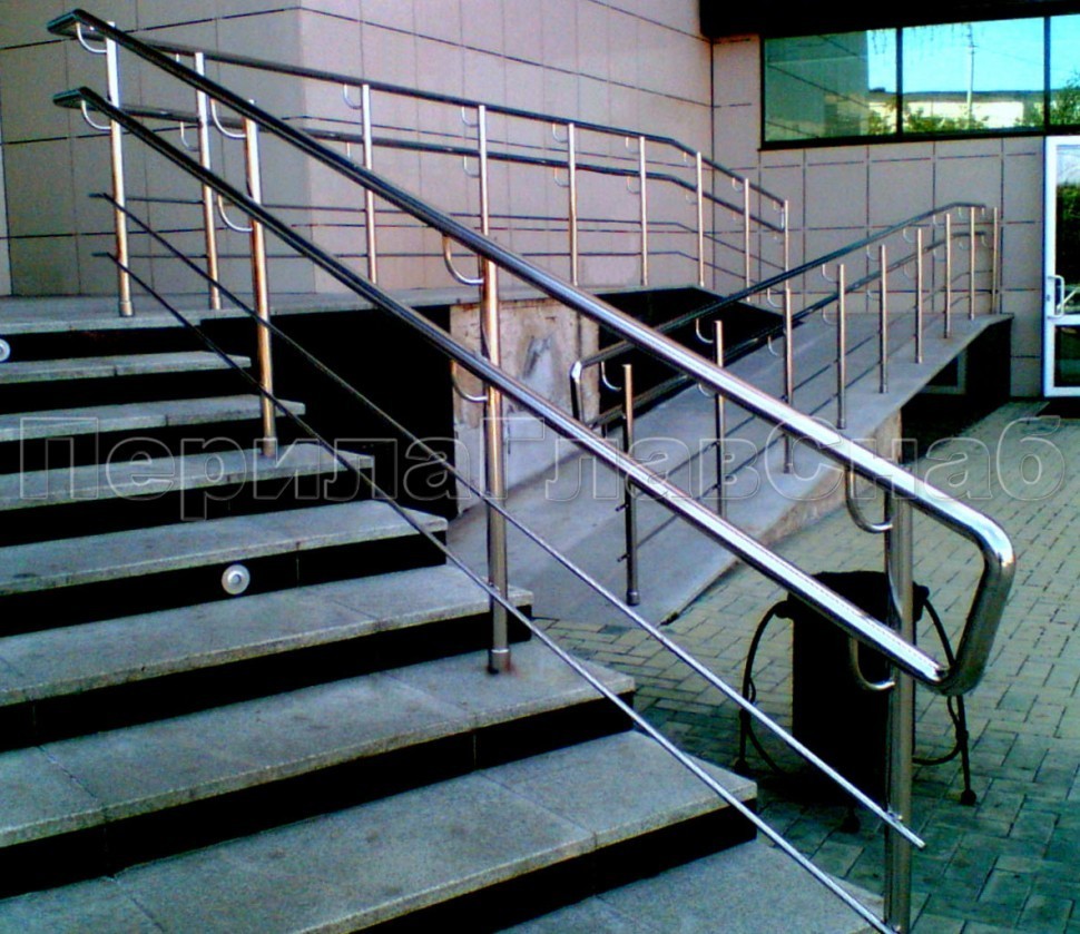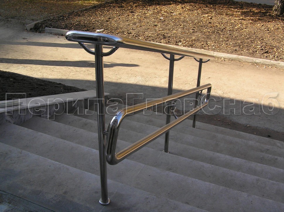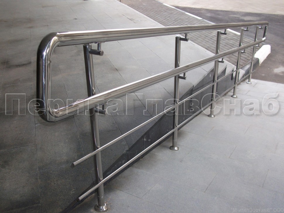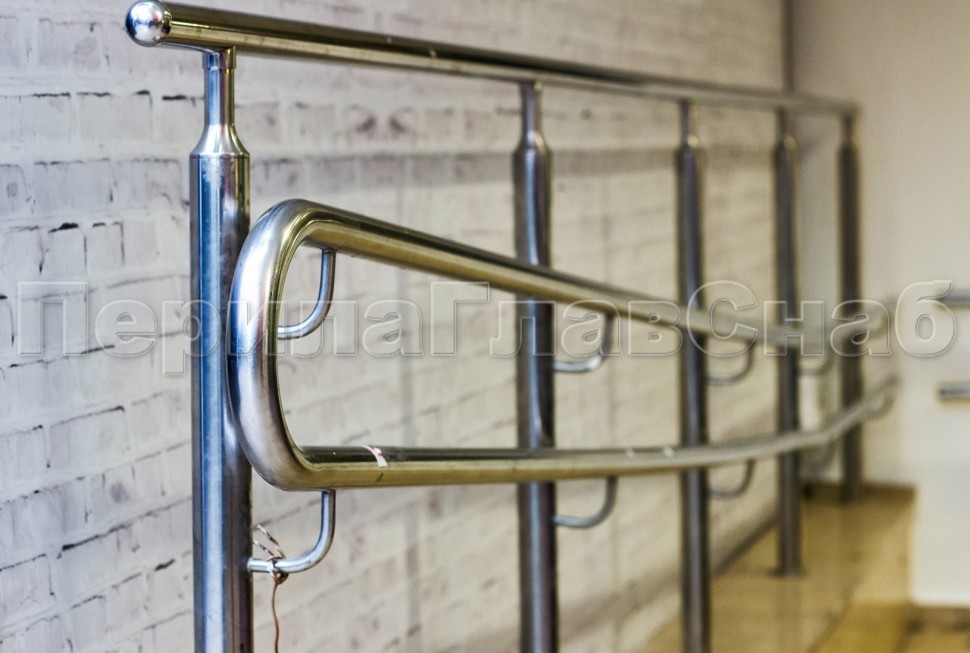 сдвоенный, из круглой нержавеющей трубы диаметром 38,1 мм. Нижний и верхний поручни завязаны при помощи отводов. Поручень может крепиться на выносные держатели.