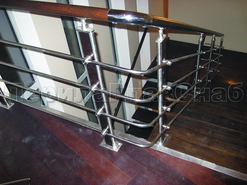 Три ригеля на сварке, квадратный деревянный поручень и круглые стойки