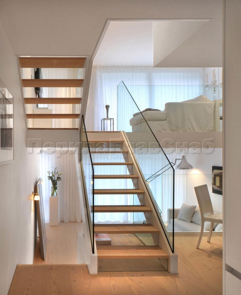 Ограждение с квадратным деревянным поручнем на точечном креплении на лестнице