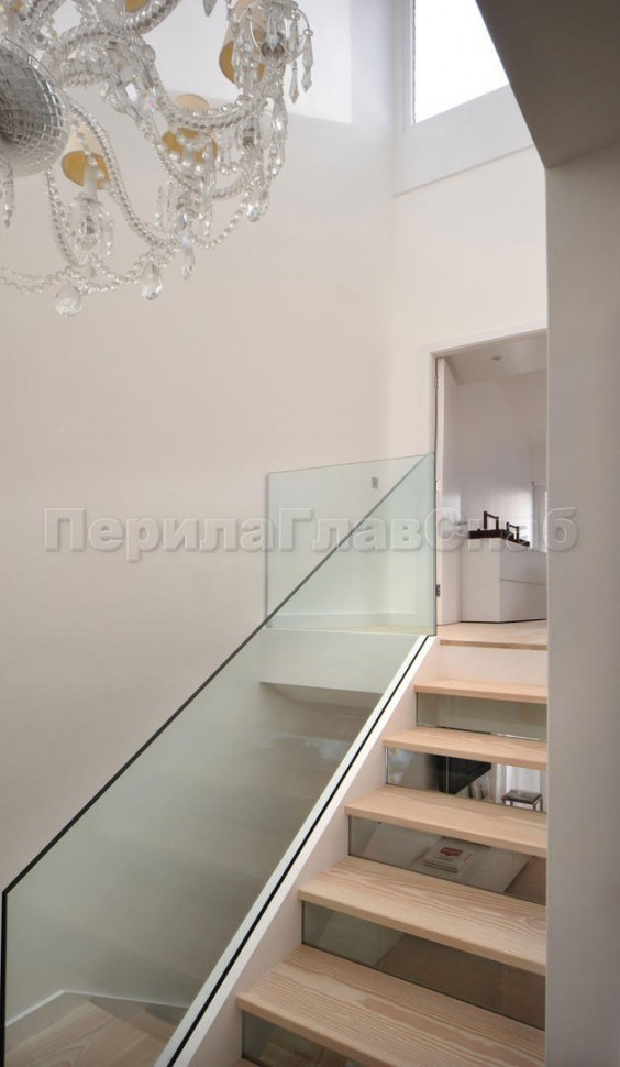Ограждение с деревянным поручнем на выносе на точечном креплении на лестнице