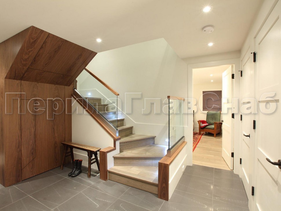 Ограждение с деревянным поручнем на точечном креплении на лестнице