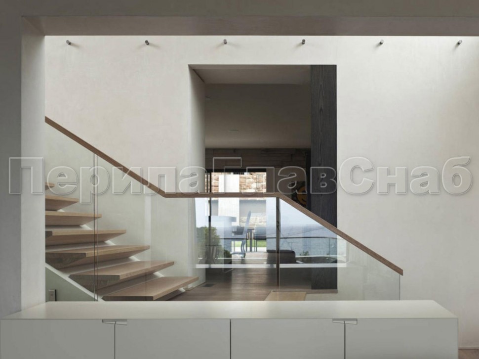 Ограждение с деревянным поручнем на выносе на точечном креплении на лестнице
