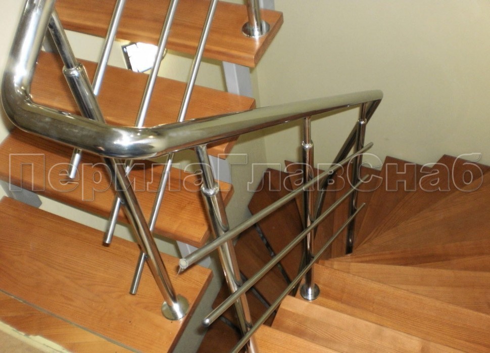 Три ригеля на сварке, квадратный деревянный поручень и круглые стойки