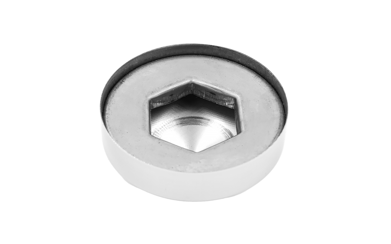 4. декоративная крышка k055-2 скрывающая под собой пластиковую шайбу, кузовную гайку, и гайку М16, плотно прилегая к стеклу своими гранями. Ничего не вылезает за кромки крышки.