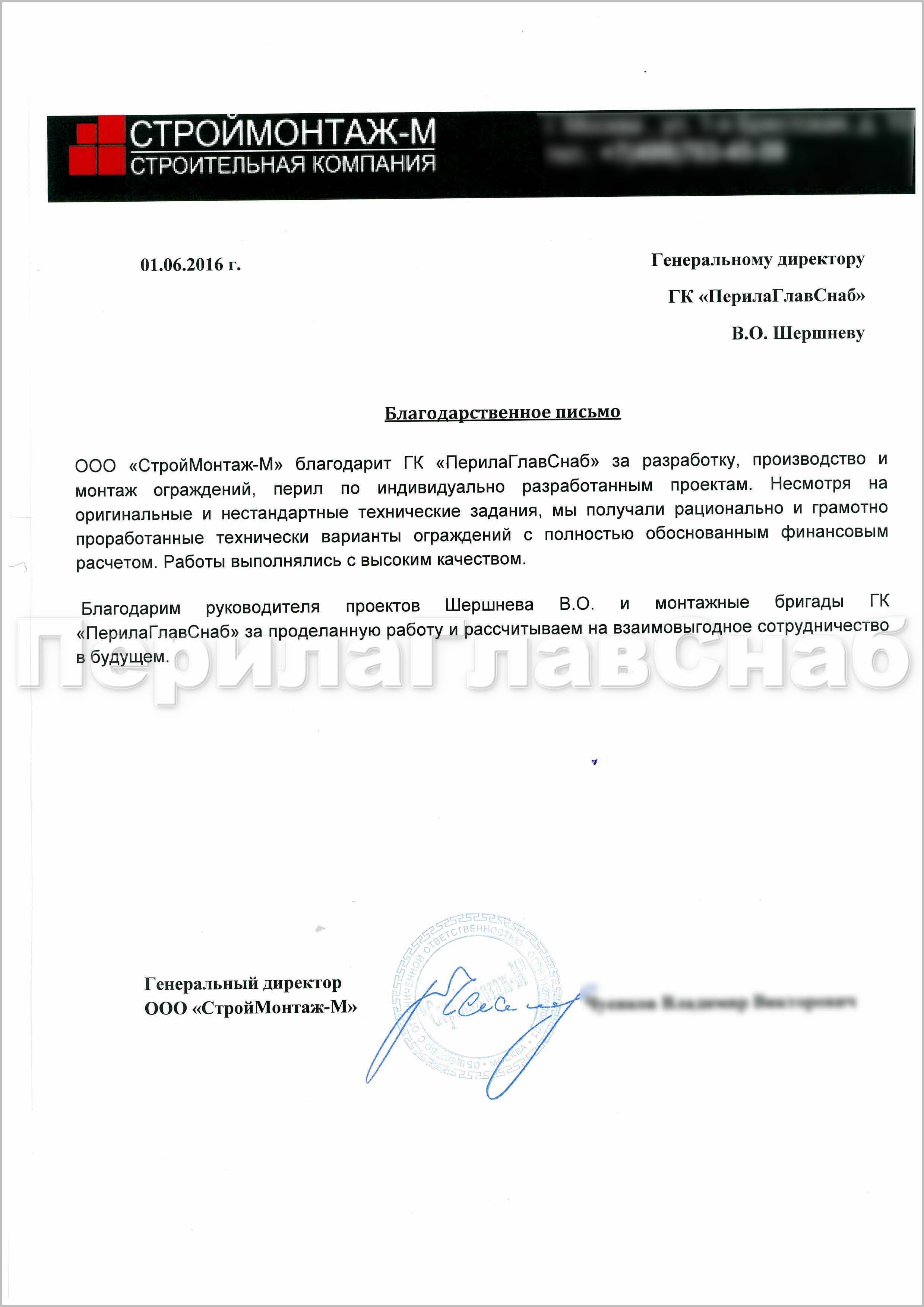 ООО "СтройМонтаж-М" благодарит ГК "ПерилаГлавСнаб" за разработку, производство и монтаж ограждений, перил по индивидуально разработанным проектам. Несмотря на оригинальные и нестандартные технические задания, мы получили рационально и грамотно проработанные технические варианты ограждений с полностью обоснованным финансовым расчетом. Работы выполнялись с высоким качеством.