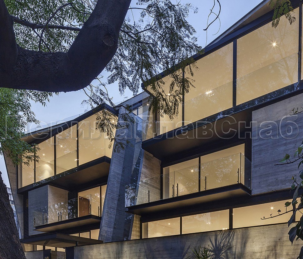 Несущая функция перераспределена между стеклом и стойками крепления.