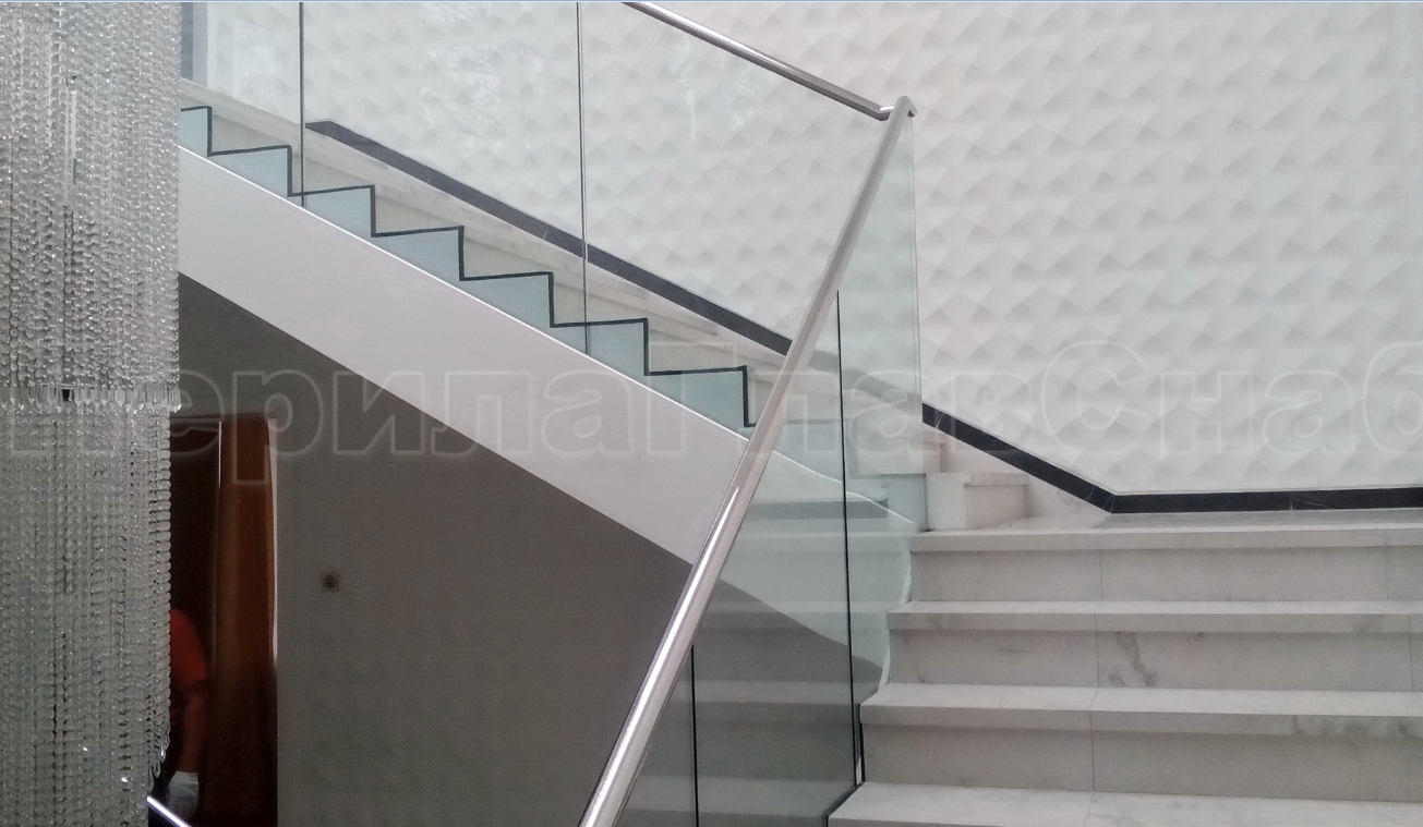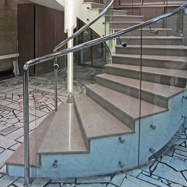 Стеклянные перила на маршевой лестнице в гостиничном комплексе