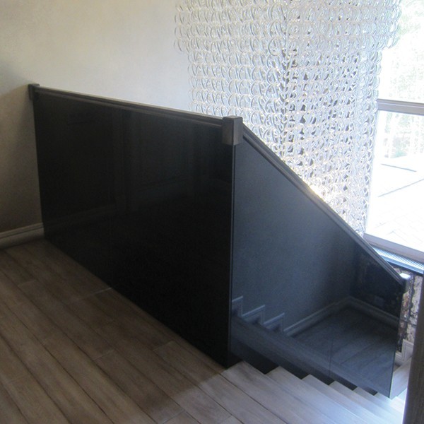 Желтое стекло в массе и нержавеющая сталь - красиво, эффектно и не дорого. Ограждения для маршевой лестницы со второго на первый этаж. В качестве поручня - круглая нержавеющая труба. Ограждения смонтированы в пол. Дешевая альтернатива цельно-стеклянным ограждениям. Когда все свои и не нужно производить впечатление на посетителей.