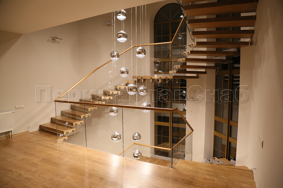 Домашний уют и технологичность объединяются в этой лестнице. Стильное боковое крепление точками в торец деревянных ступеней. Прочный 10х10 мм каленый триплекс и поручень из трубы с пазом (полировка). Клиент приятно удивлен, ему удобно и комфортно. Очень красивое ограждение.