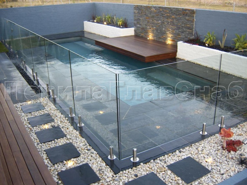 Ограждение с квадратным деревянным поручнем на точечном креплении