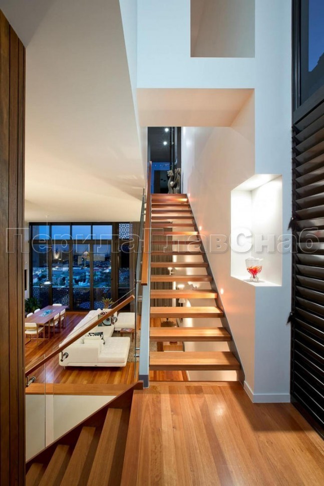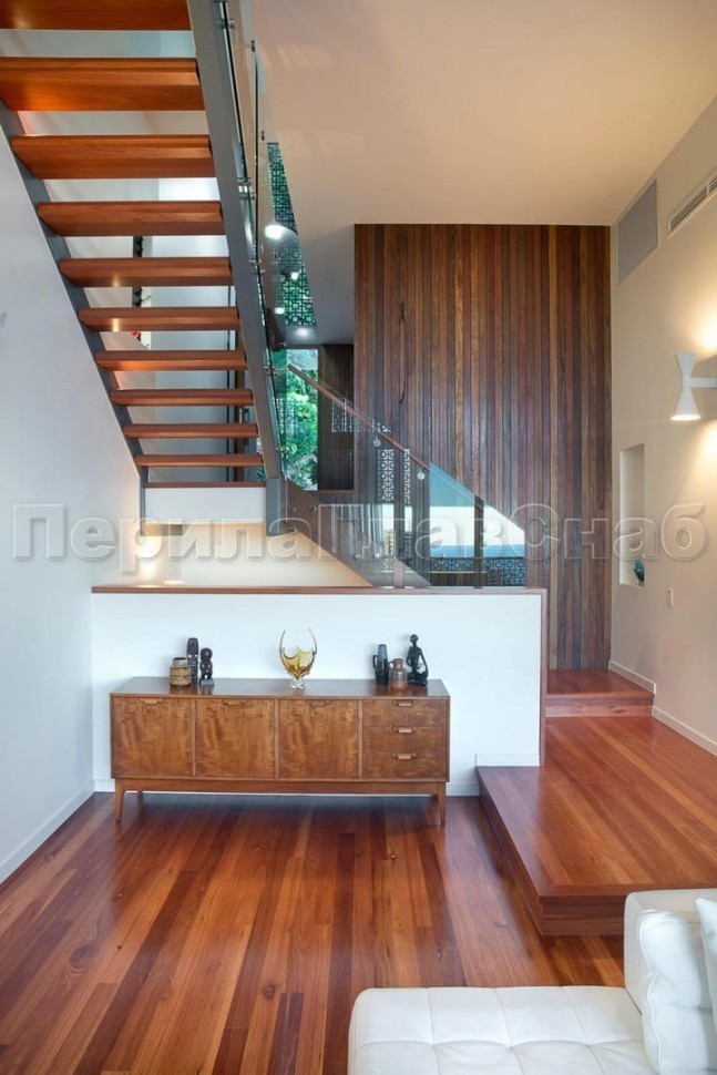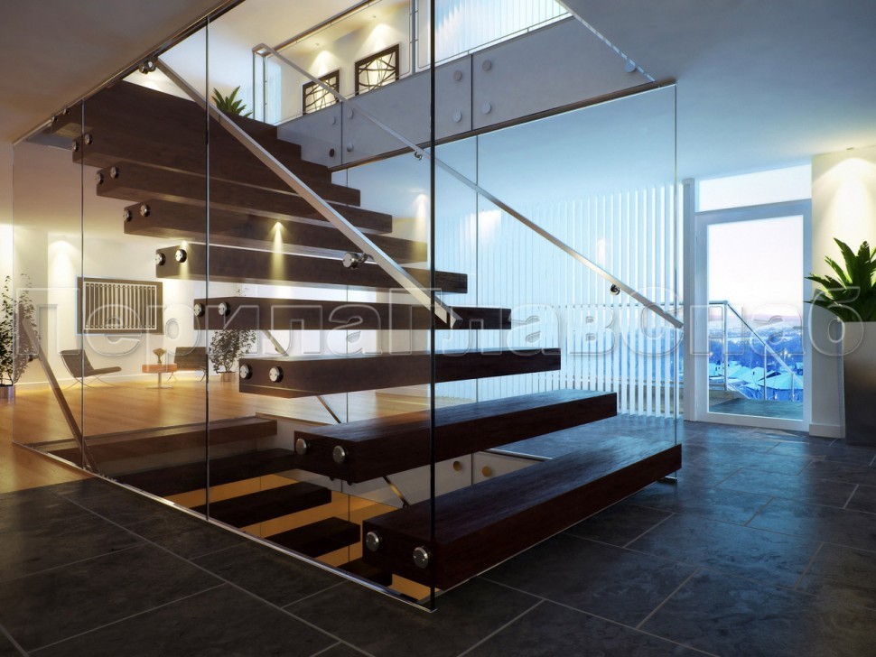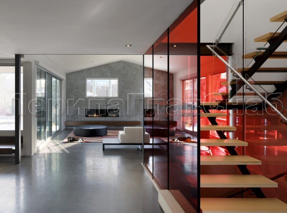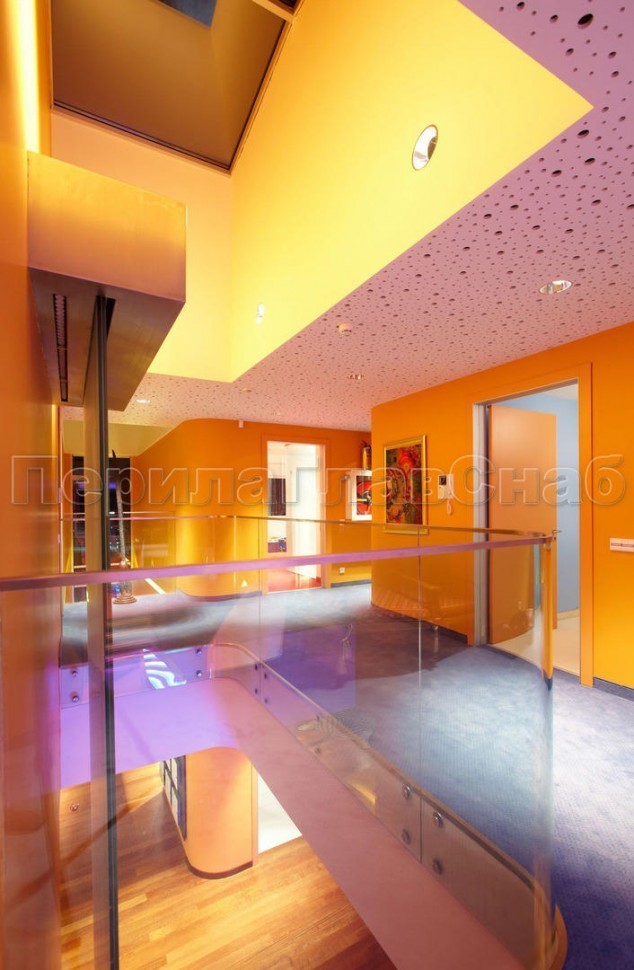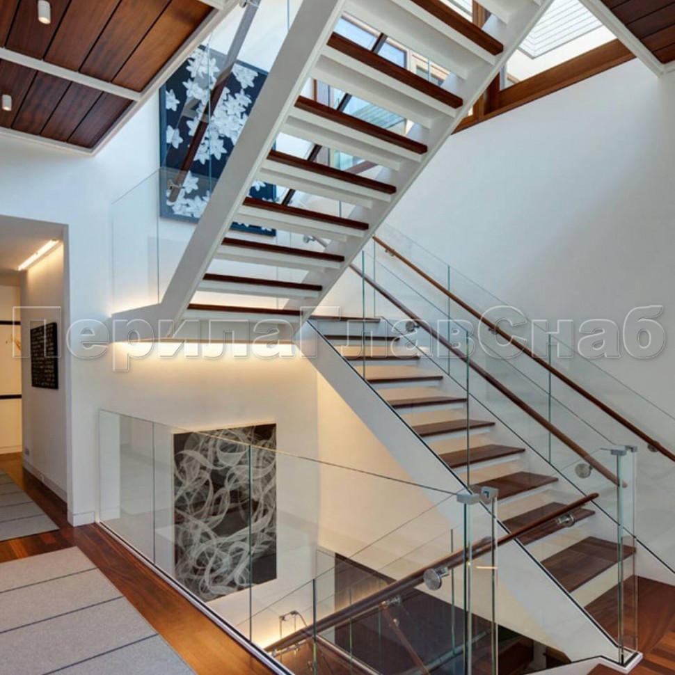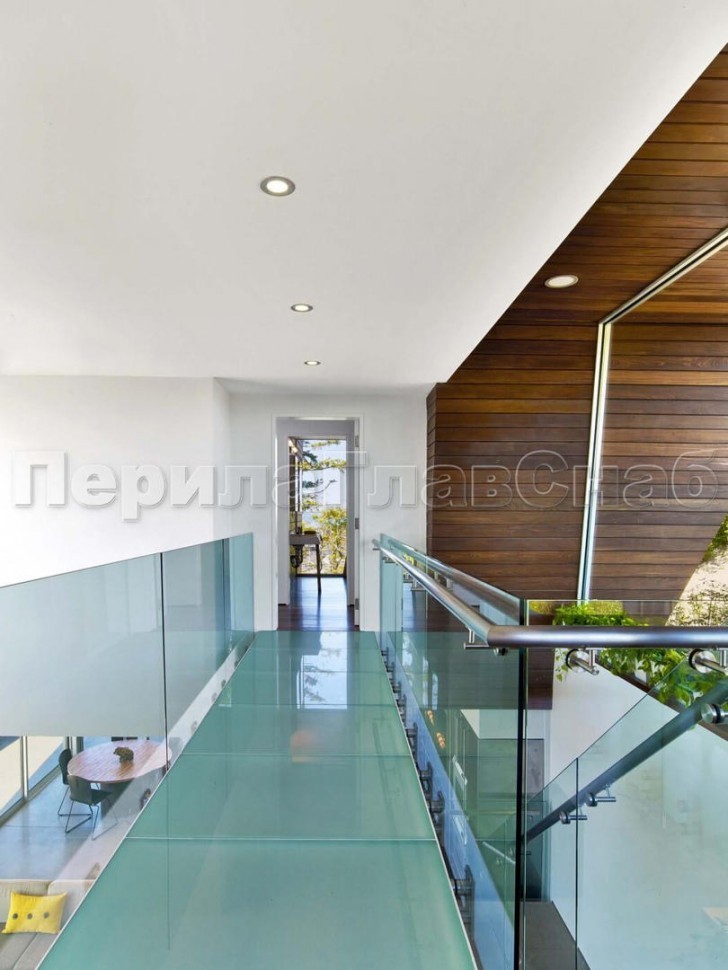 Красивая опция - частичная матировка нижней части несущего стекла (делают обычно там, где стекло примыкает к лестничному маршу или перекрытию).