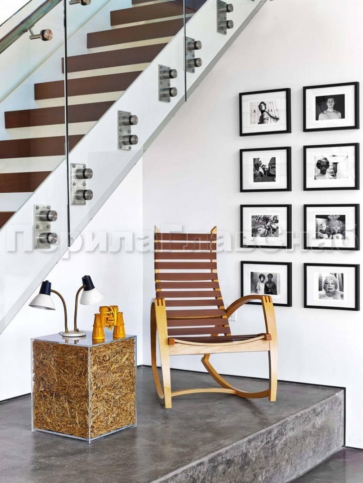 - Самый интересный вариант - установка защитного профиля на кромку стекла и специального выносного поручня.