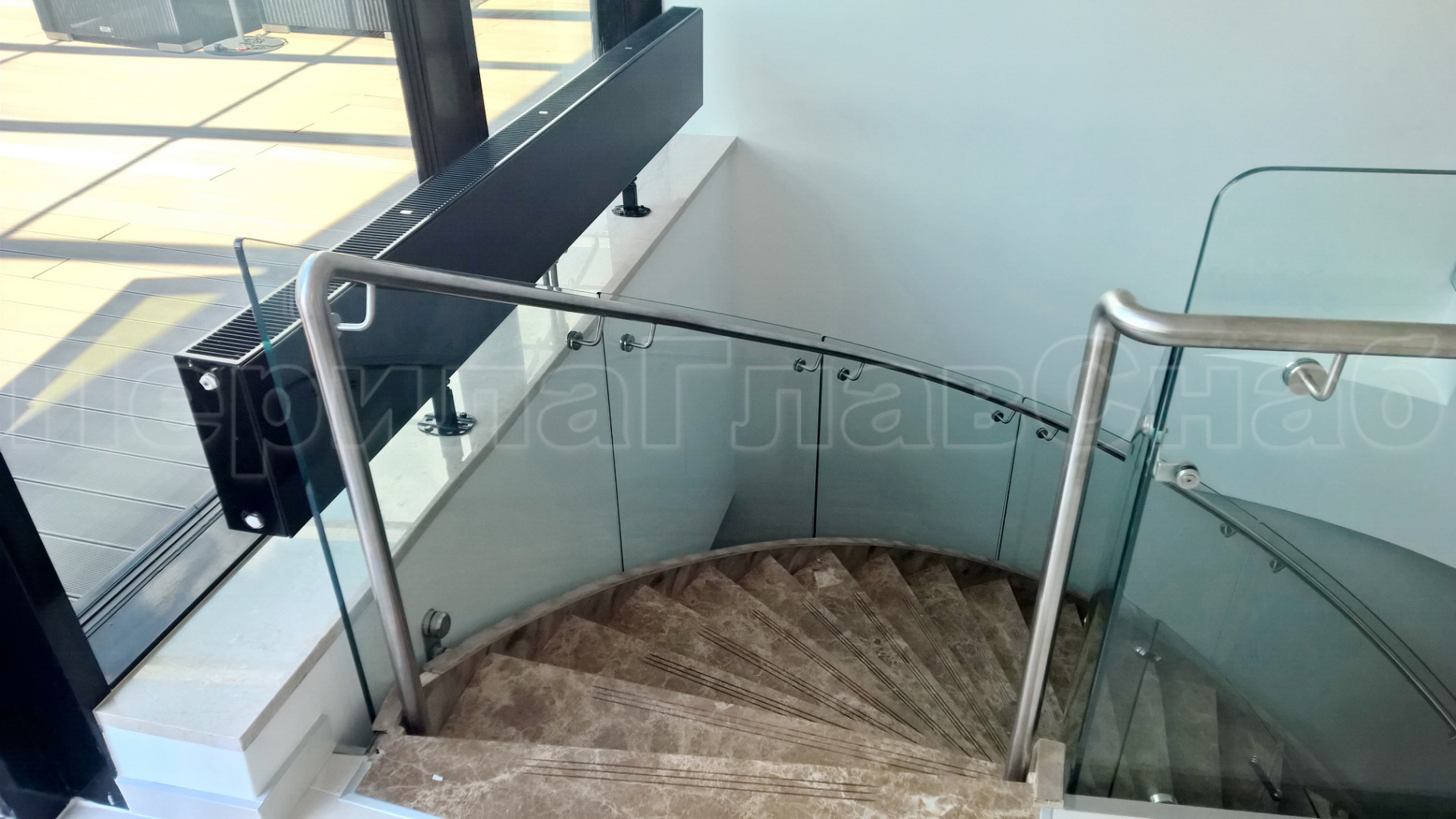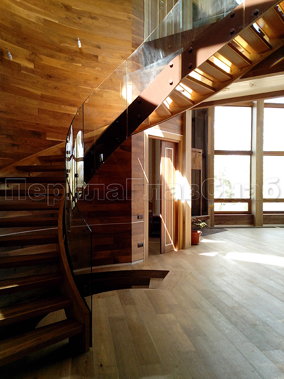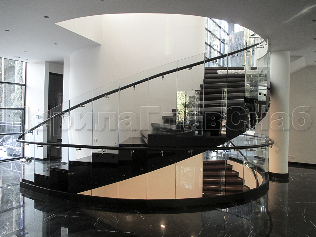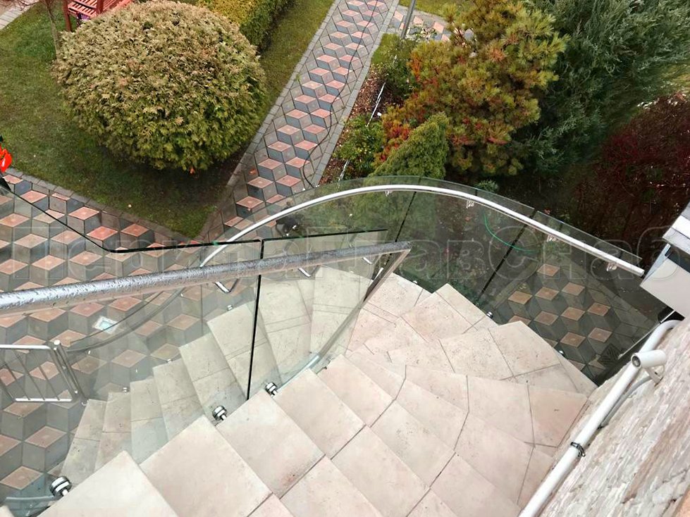 Цельностеклянные конструкции изготавливают из секций радиальной формы. При кажущейся простоте производство и монтаж таких перил требует большого опыта и мастерства, чтобы равномерно установить все элементы по спирали и сделать сварные швы незаметными. В качестве бюджетного аналога используют ограждения из прямых стеклянных экранов, закрепленных на металлические стойки.