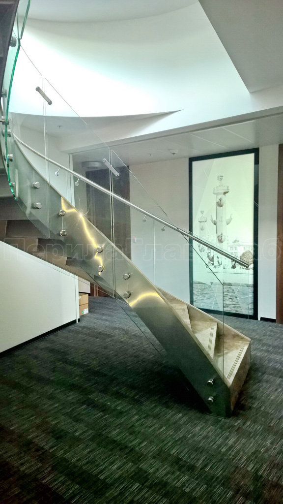 Примеры цельностеклянных ограждений на забежных лестницах: