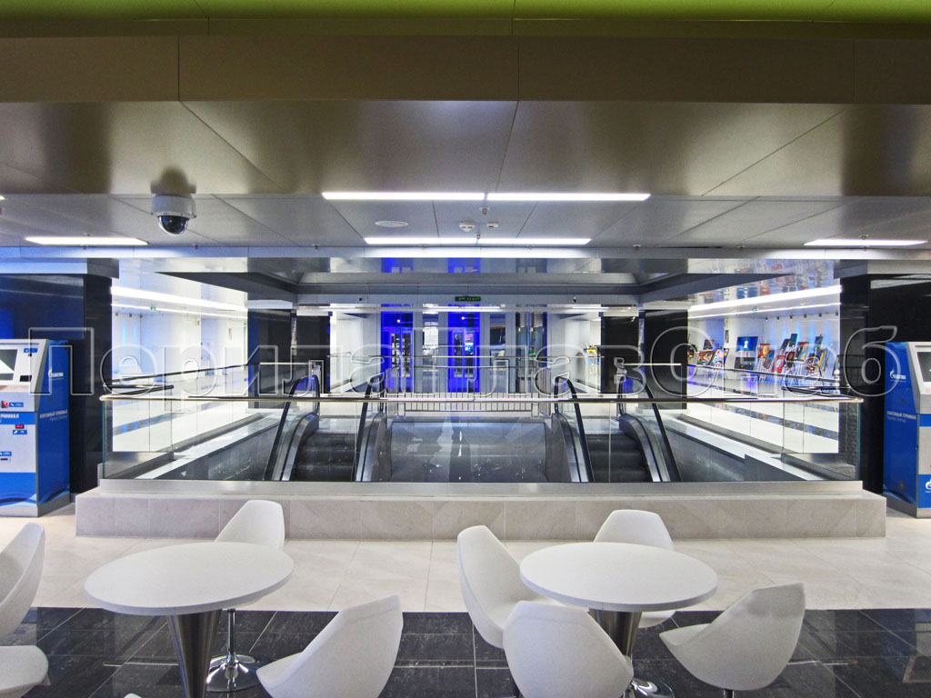Фасад торгового центра полностью стеклянный, поэтому фронтальную часть ограждений входных групп заказчик попросил изготовить стеклянной на стойках. Эффекта прозрачности достигли путем использования 8-ми миллиметрового ультрапрозрачного стекла. Для стальных деталей перил использовали сталь тройной полировки AISI304L. Тройная полировка позволяет продлить срок жизни стальных ограждений.