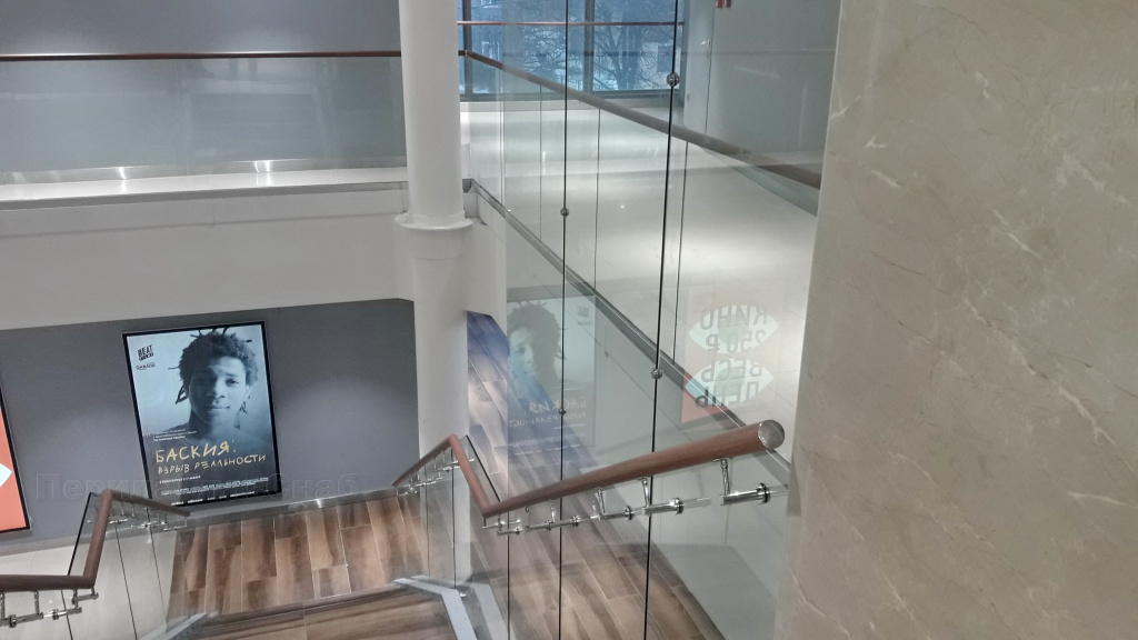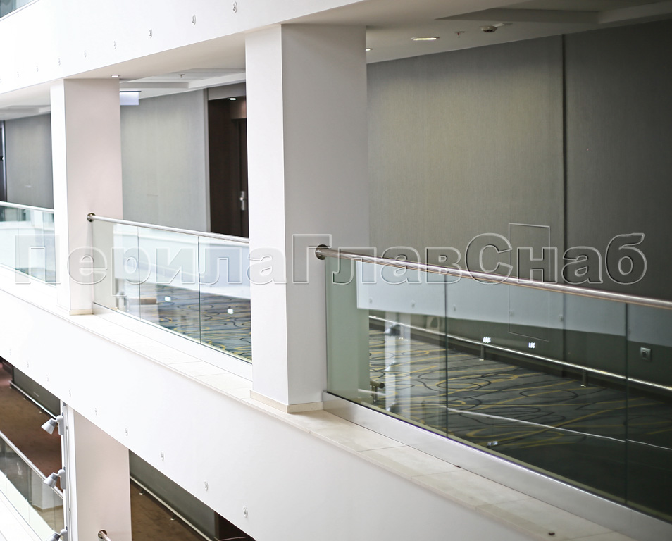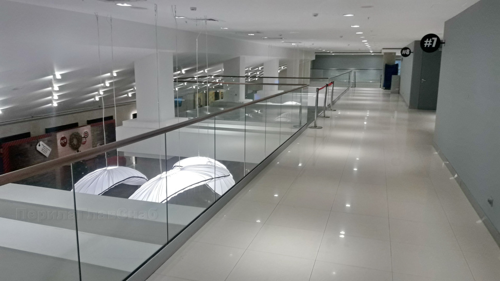Несущее стекло для атриума установлено на алюминиевый анодированный профиль. Преимущества такого профиля в том, что он обладает зеркальным блеском, крепится на анкера и обладает огромной надежностью (выдерживает очень большие нагрузки и на разгиб). Для комфорта посетителей был использован поручень из трубы с пазом. Труба с пазом - идеальный поручень для несущего стекла,удобна в эксплуатации, а так же защищает кромку стекла.