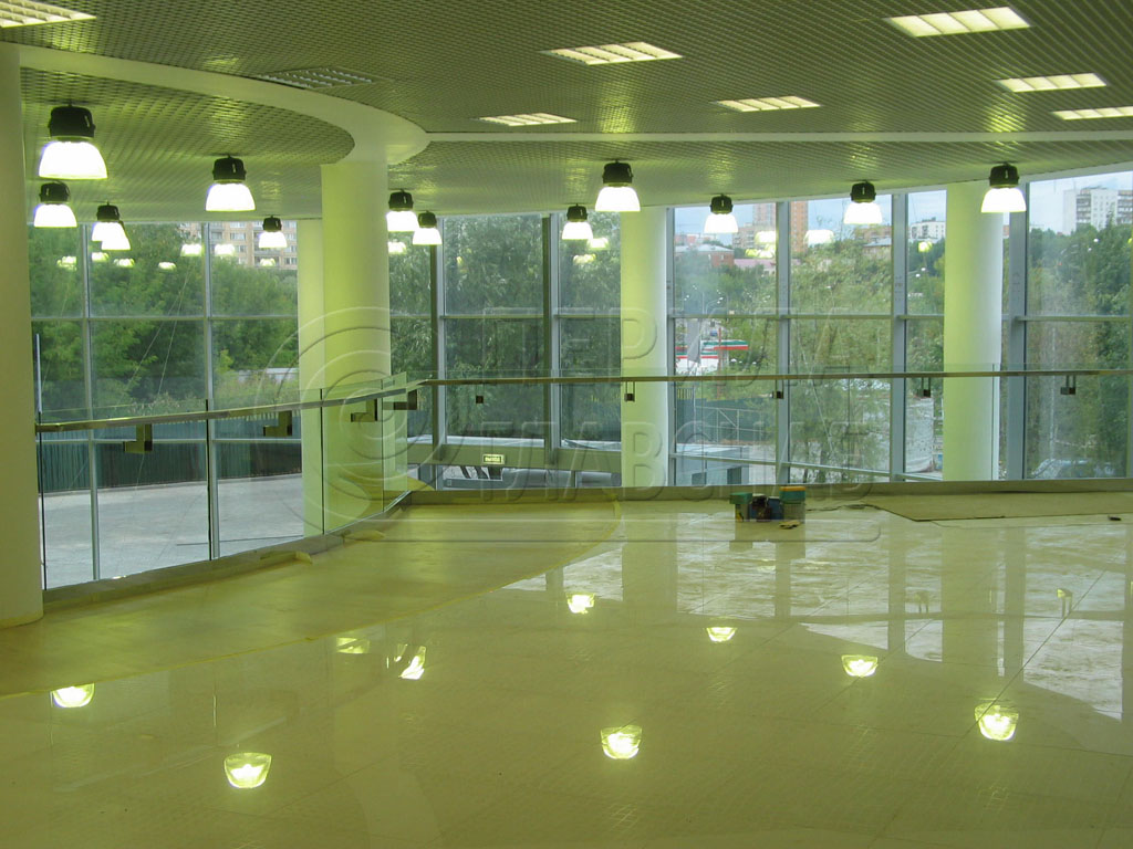 Описание: Заказчик поставил задачу установить надежные, удароустойчивые ограждения в офисный центр. Плюс требовалось подчеркнуть респектабельность и успешность проекта. Ограждения устанавливались в полностью подготовленный интерьер с мраморной плиткой. Сроки были очень сжаты, заказчик торопился со сдачей проекта. Наш отдел проектирования предложил следующее решение: ограждения на несущем стекле с креплением на анодированный профиль. Характеристики: