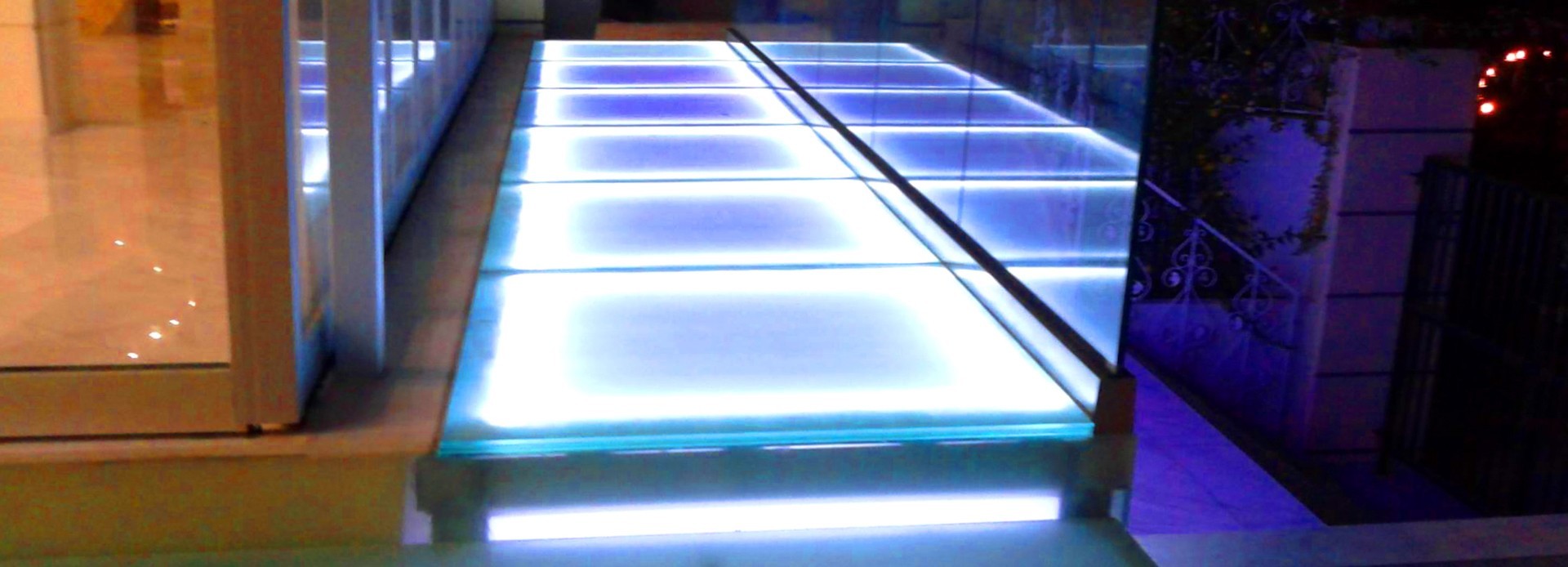 Иллюминация на стеклянных полах и стеклянных подиумах может быть обеспечена при помощи светодиодных лент встроенных в торец стеклянного блока или в несущий профиль (в зависимости от технологии монтажа).